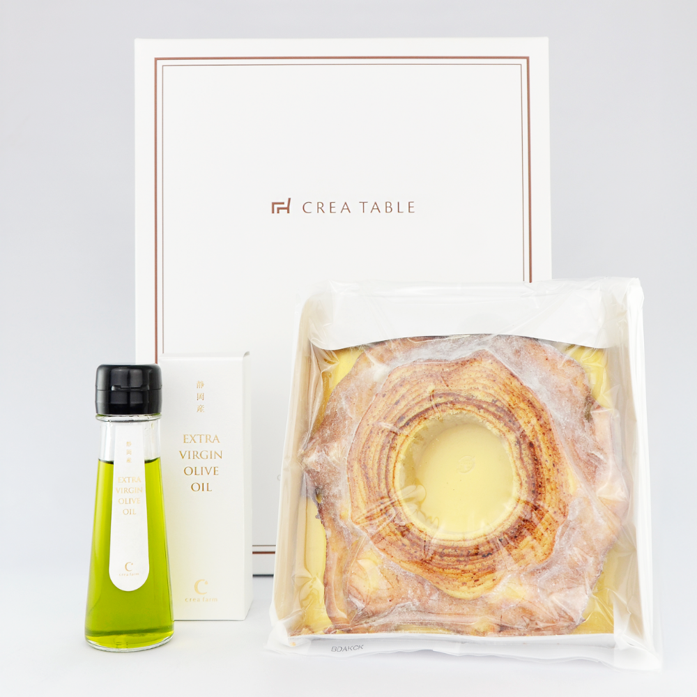 crea farmが静岡の自社農園で栽培から搾油まで一貫して生産した、フレッシュで香り高いエキストラバージンオリーブオイルと、オリーブを食べて育った鶏の卵を使用したバームクーヘンをセットにしました。オリーブオイルをバームクーヘンにつけて食べる、新しい楽しみ方を体験してみてください。オリーブオイルの豊かな香りと甘さが絶妙にマッチし、上品で奥深い味わいが広がります。