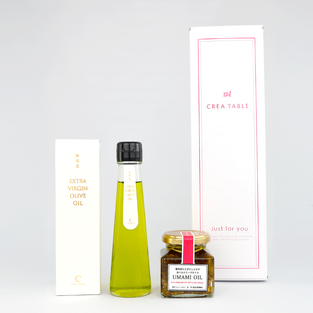 crea farm(クレアファーム)が静岡のオリーブ農園で栽培から収穫・搾油まで一貫して生産した静岡産のプレミアムなエキストラバージンオイルと、静岡産の旨味食材を使用した逸品 静岡産わさびとしらすの食べるオリーブオイルのセットです。日本テレビ「満点☆青空レストラン」でもご紹介いただいた当店ベストセラー商品。美味と健康を届ける、上質を知る方への特別なギフトセットです。